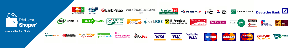 Przelew na konto bankowe – po złożeniu zamówienia towar zostanie dla Ciebie zarezerwowany, a na swój adres e-mail otrzymasz numer rachunku bankowego, na który należy przelać właściwą kwotę. Przelew możesz wysłać ze strony internetowej swojego banku, w placówce banku lub na poczcie. Wybieranie tej metody wydłuży całkowity czas realizacji zamówienia o czas potrzebny na zaksięgowanie Twojej wpłaty.