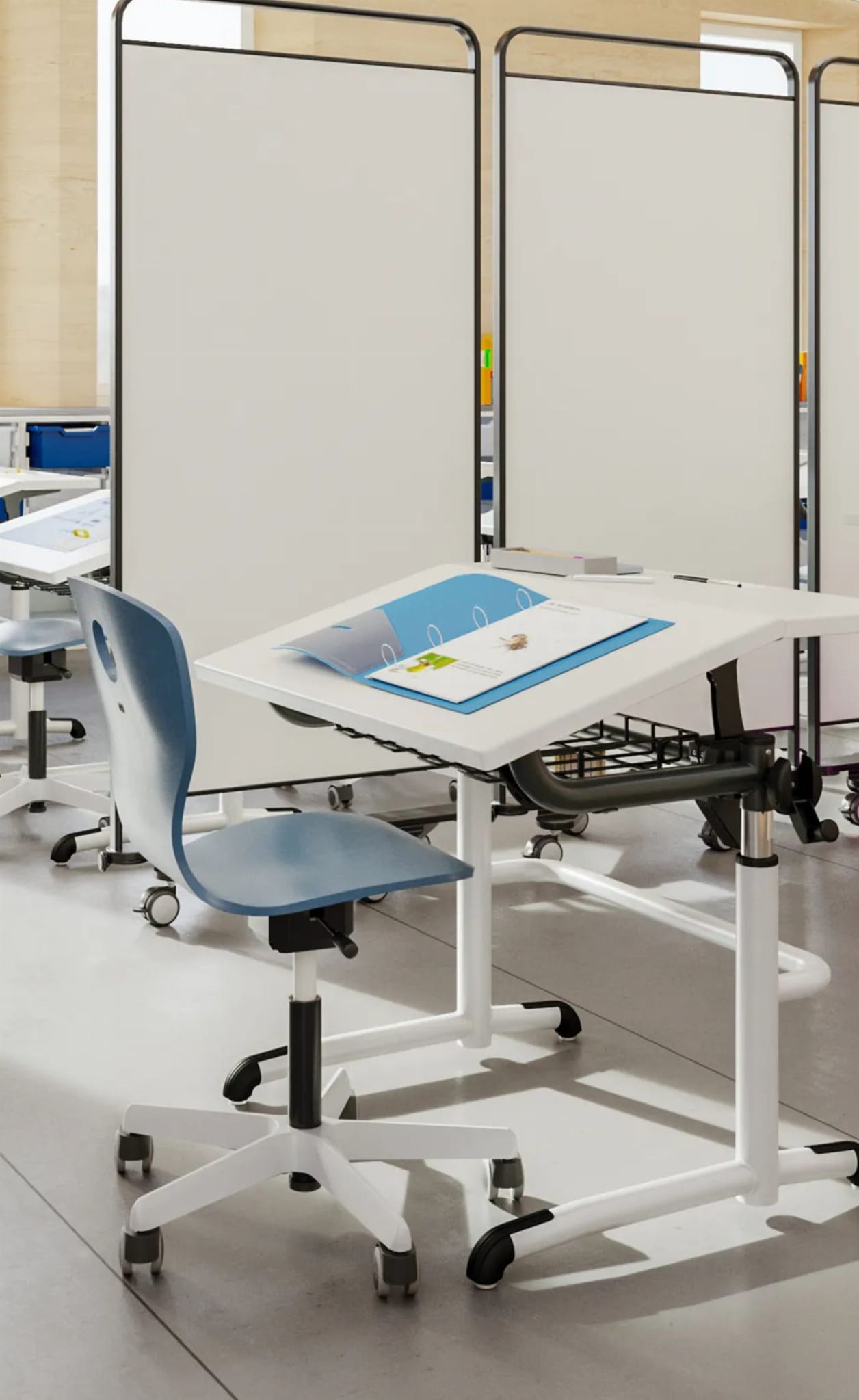 Regulacja wysokości: dostępne różne zakresy wysokości zgodnie z normą DIN EN 1729 – dopasowane do wzrostu uczniów i wymogów ergonomicznych.