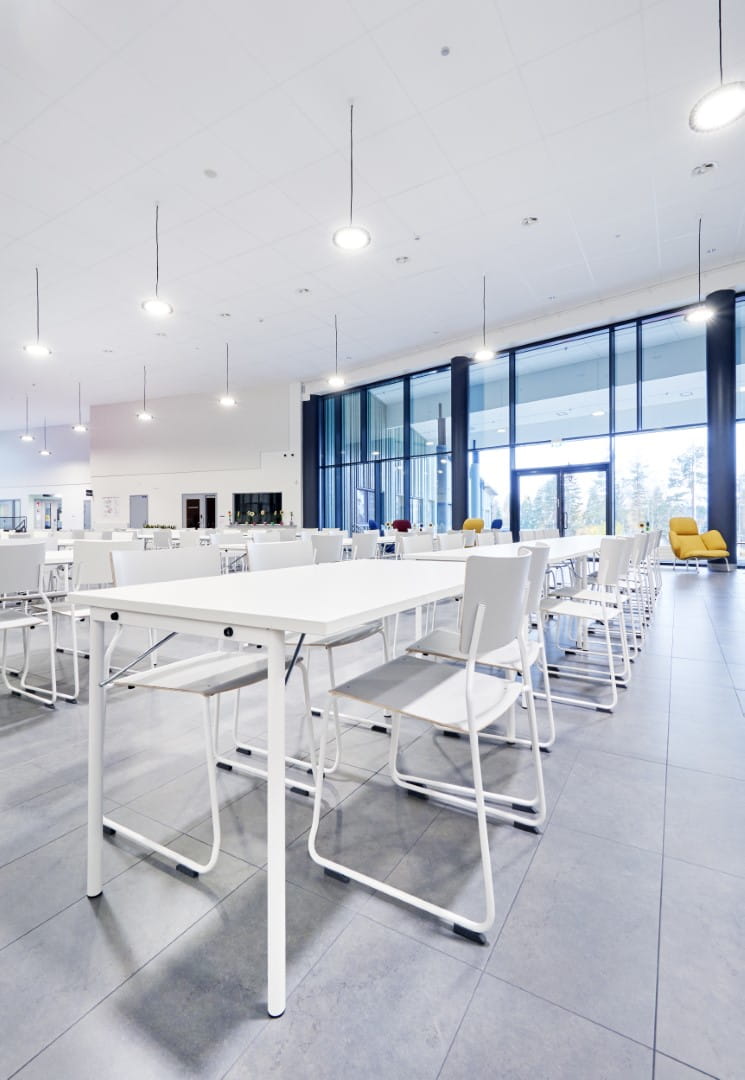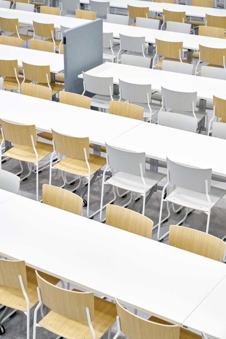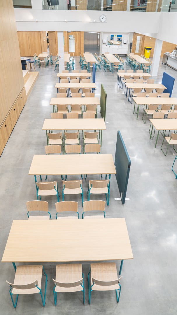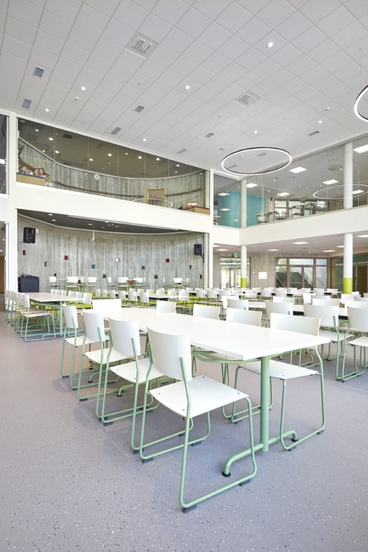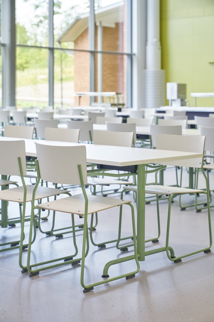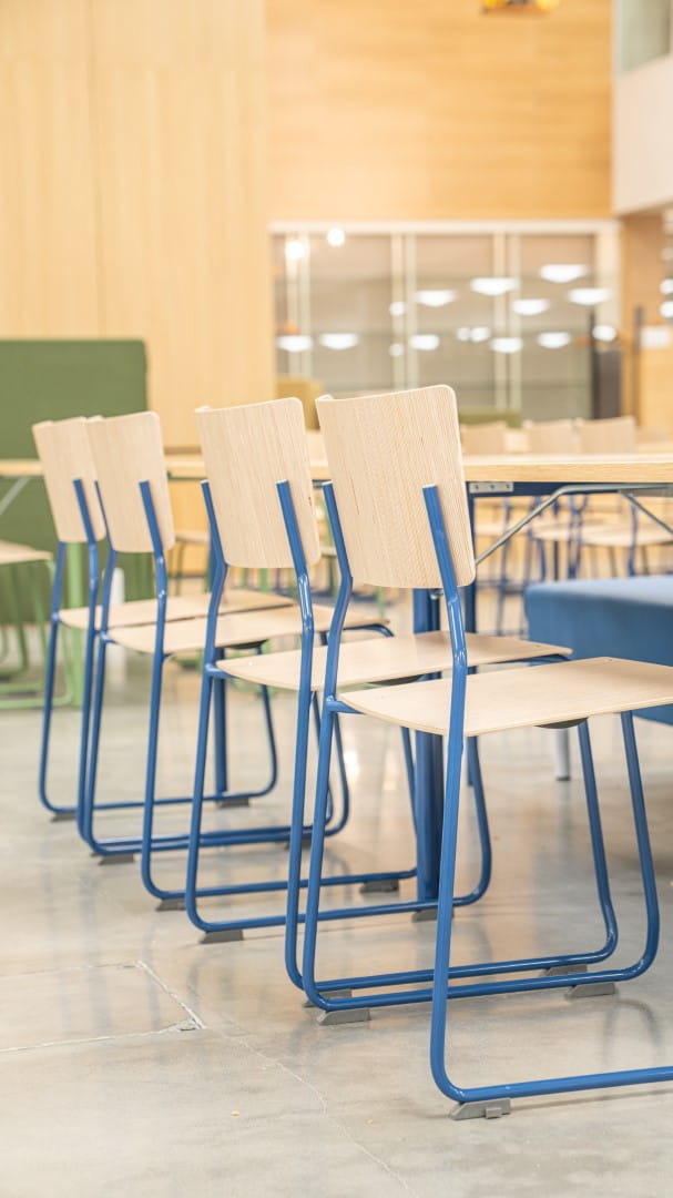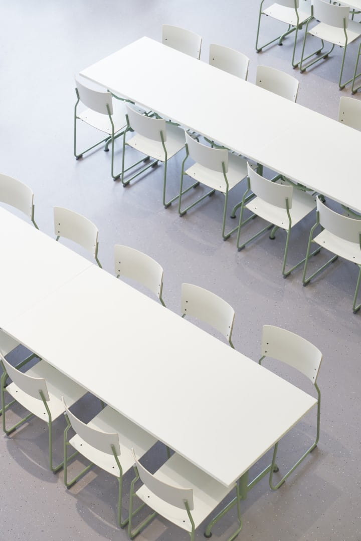 Matti to dobre rozwiązanie dla stołówek, ponieważ można je zawiesić pod stołem, co ułatwia czyszczenie. Krzesła mogą również być łączone w rzędy za pomocą niewidocznego mechanizmu łączącego.