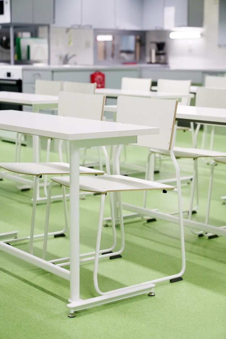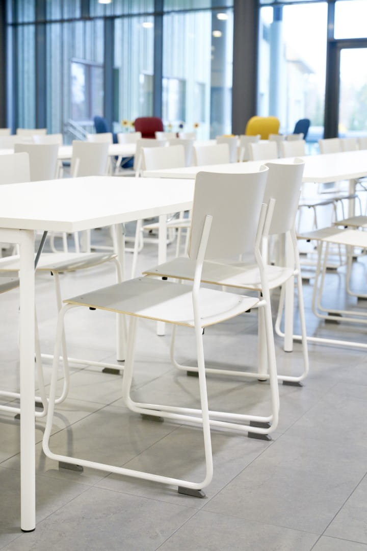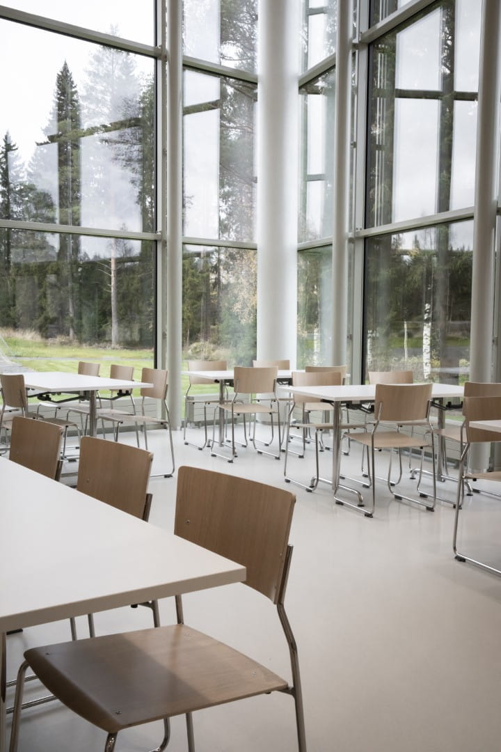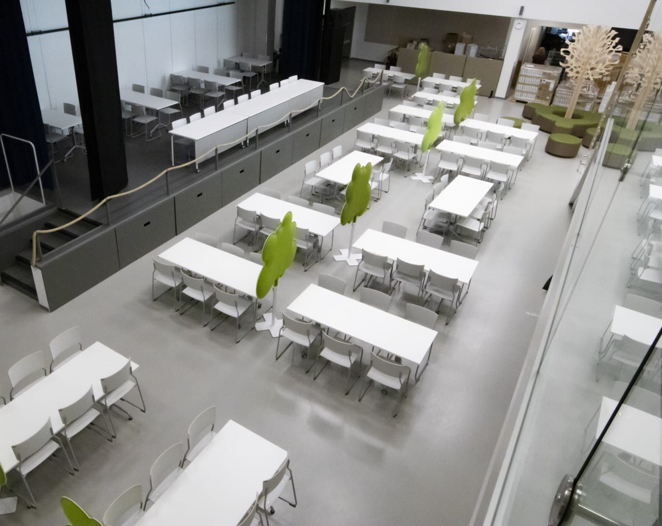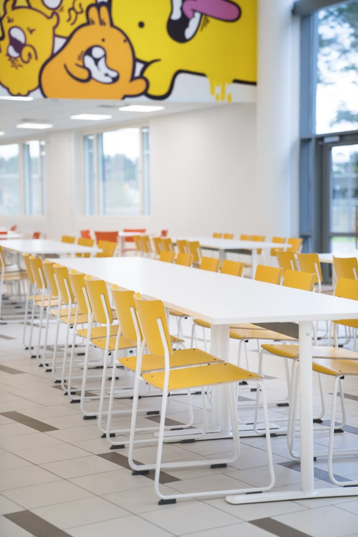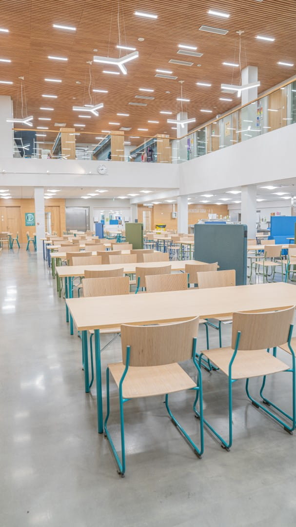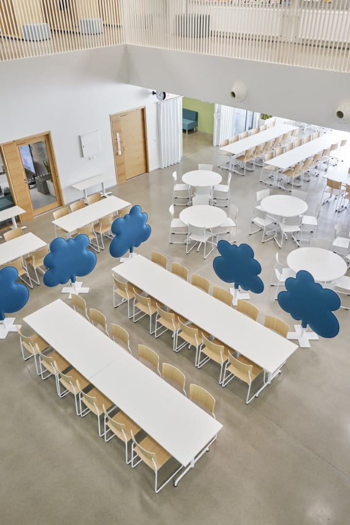 Matti to dobre rozwiązanie dla stołówek, ponieważ można je zawiesić pod stołem, co ułatwia czyszczenie. Krzesła mogą również być łączone w rzędy za pomocą niewidocznego mechanizmu łączącego.