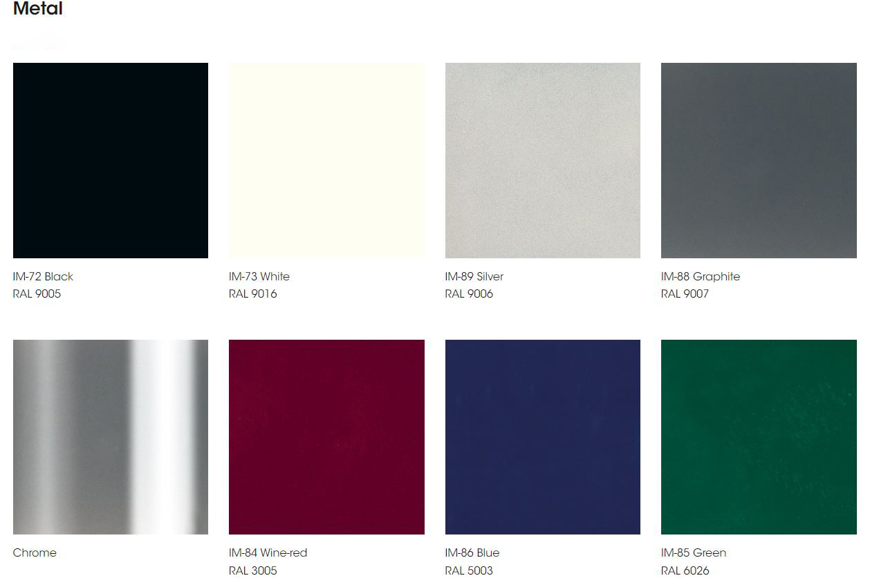 - laminat (biały, czarny, jasnoszary lub ciemnoszary, brzoza, buk, dąb) lub plastik (bordowy, szary, czerwony, buk, niebieski, zielony, brzoza).
