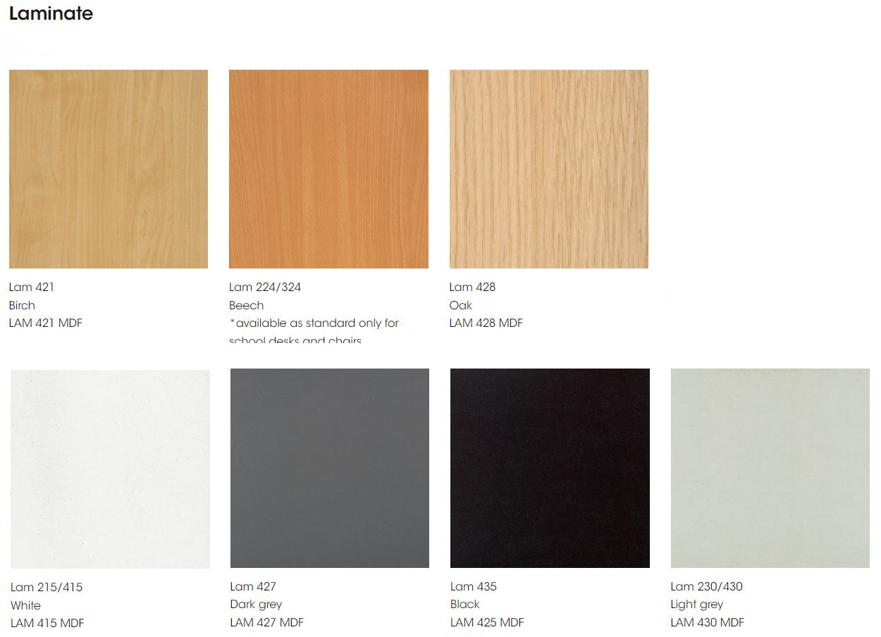 - laminat (biały, czarny, jasnoszary lub ciemnoszary, brzoza, buk, dąb) lub plastik (bordowy, szary, czerwony, buk, niebieski, zielony, brzoza).