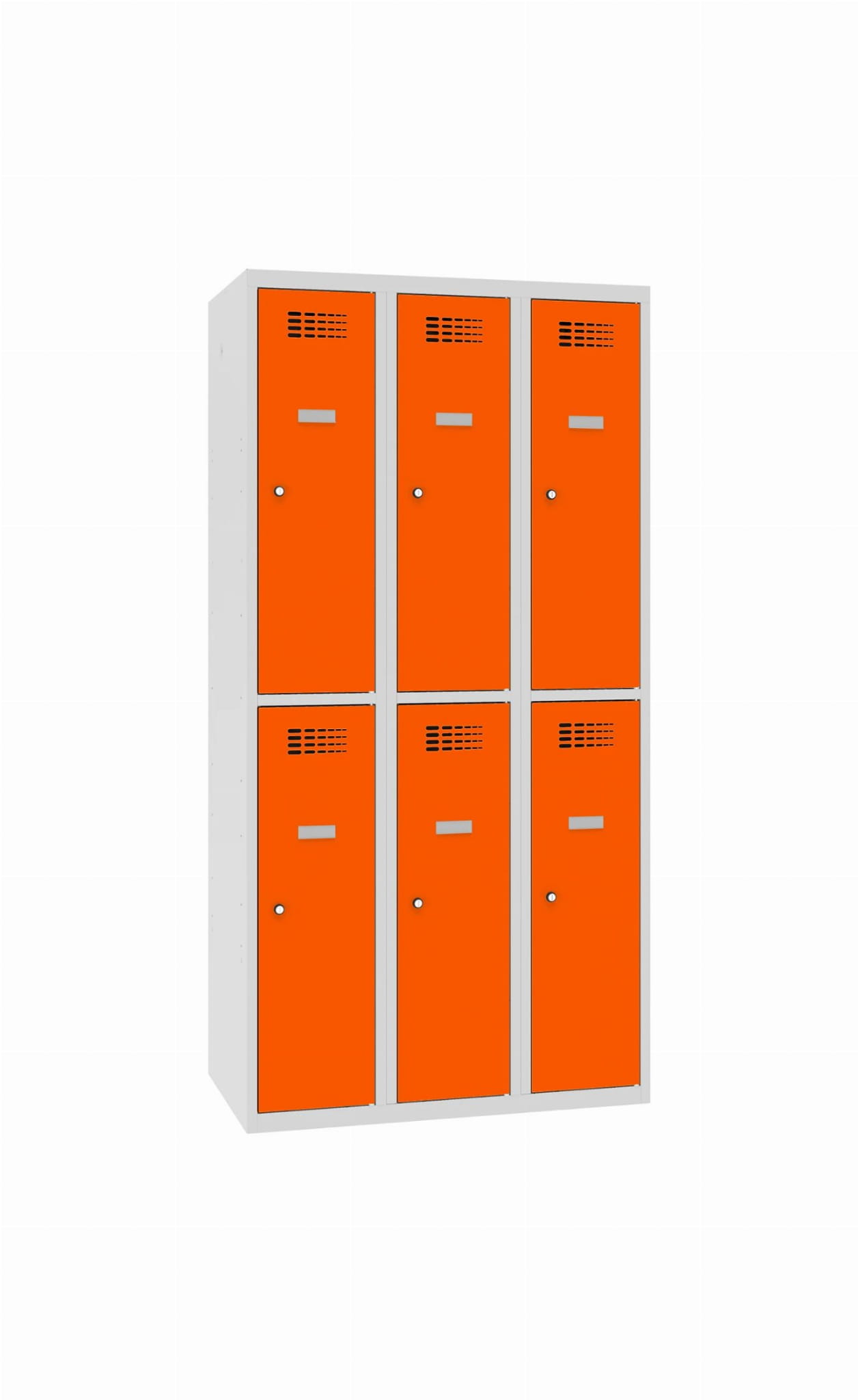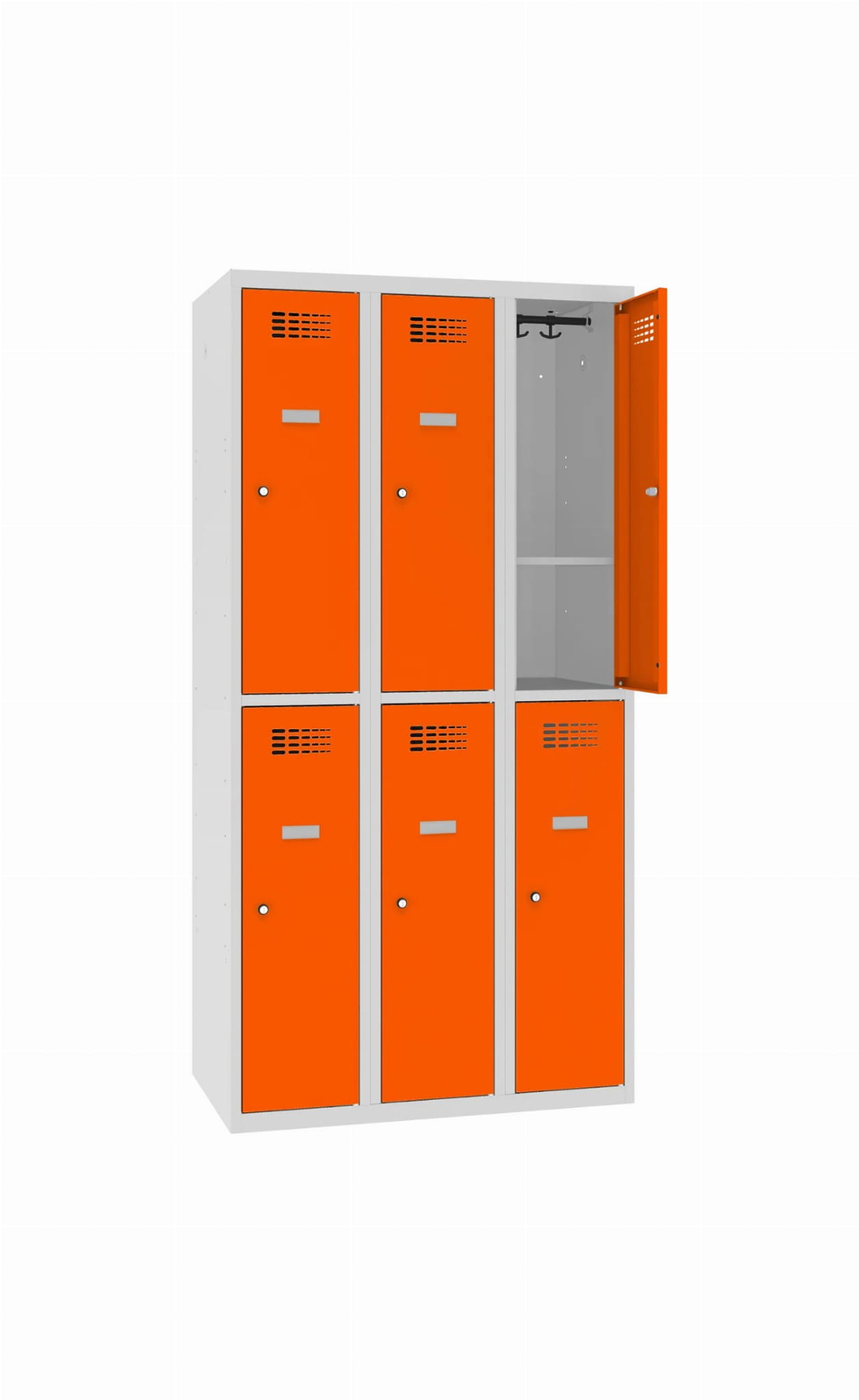 SUS S to rodzina szaf szkolnych stworzona specjalnie dla najmłodszych – całkowita wysokość szafki to 1450 mm! SUS S to rodzina szkolnych szaf ubraniowych wyposażonych w drążek ubraniowy z dwoma haczykami na ubrania, półkę poziomą w każdej skrytce, samoprzylepny szyldzik oraz otwory wentylacyjne zwiększające cyrkulację powietrza.
