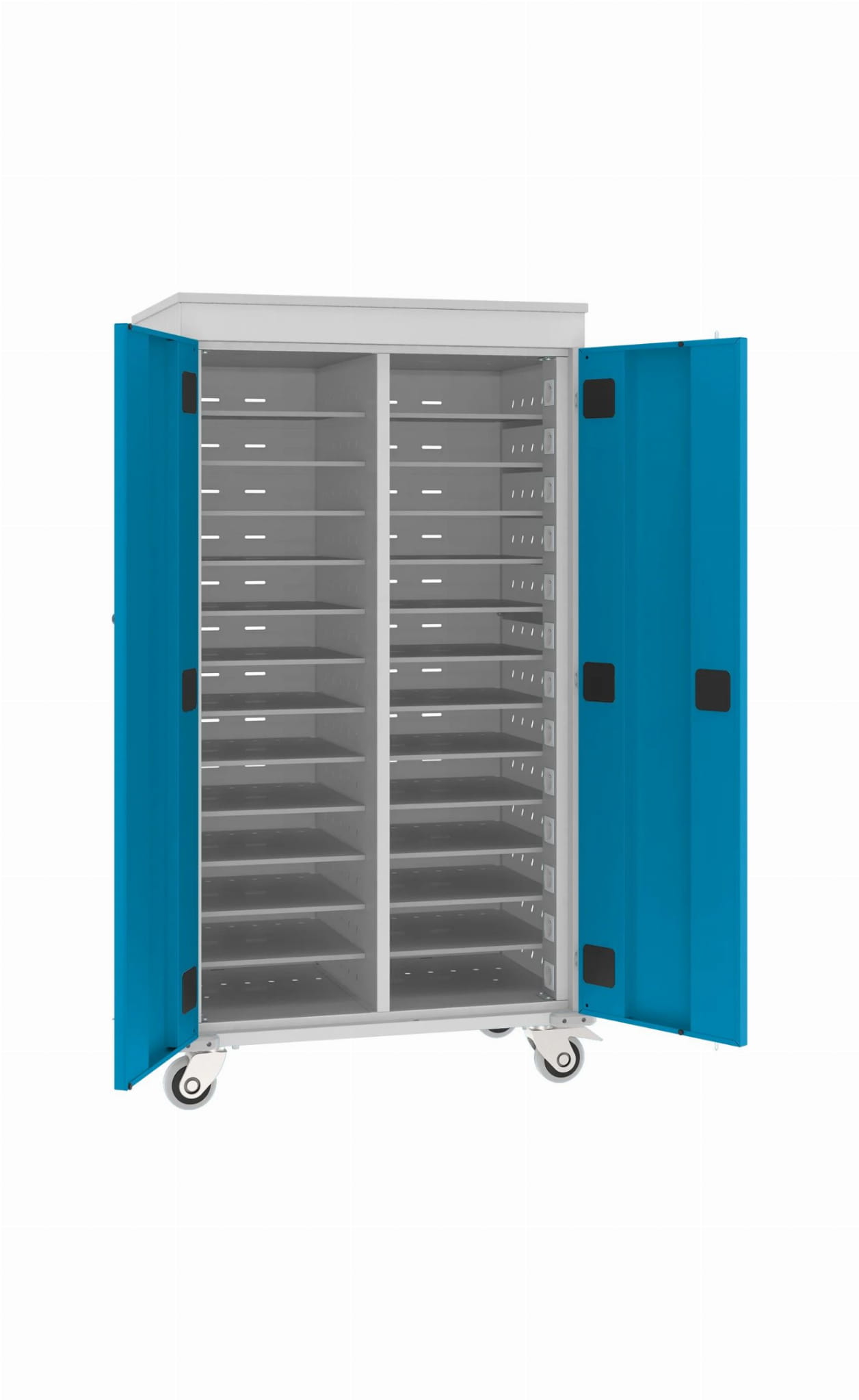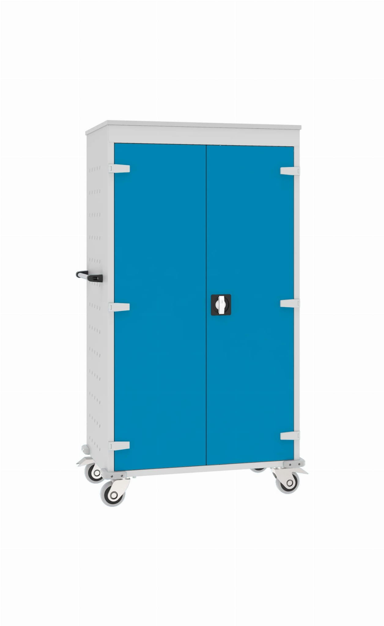 Sprawdza się idealnie w szkołach, na uczelniach, bibliotekach czy salach konferencyjnych, czyli wszędzie tam, gdzie istnieje konieczność bezpiecznego przechowywania i jednoczesnego ładowania laptopów. Zawartość szaf jest chroniona przez drzwi wyposażone w zamek. Przemieszczanie wózka jest możliwe, dzięki 4 skrętnym kołom (w tym 2 z blokadą) i uchwytom na bokach urządzenia.