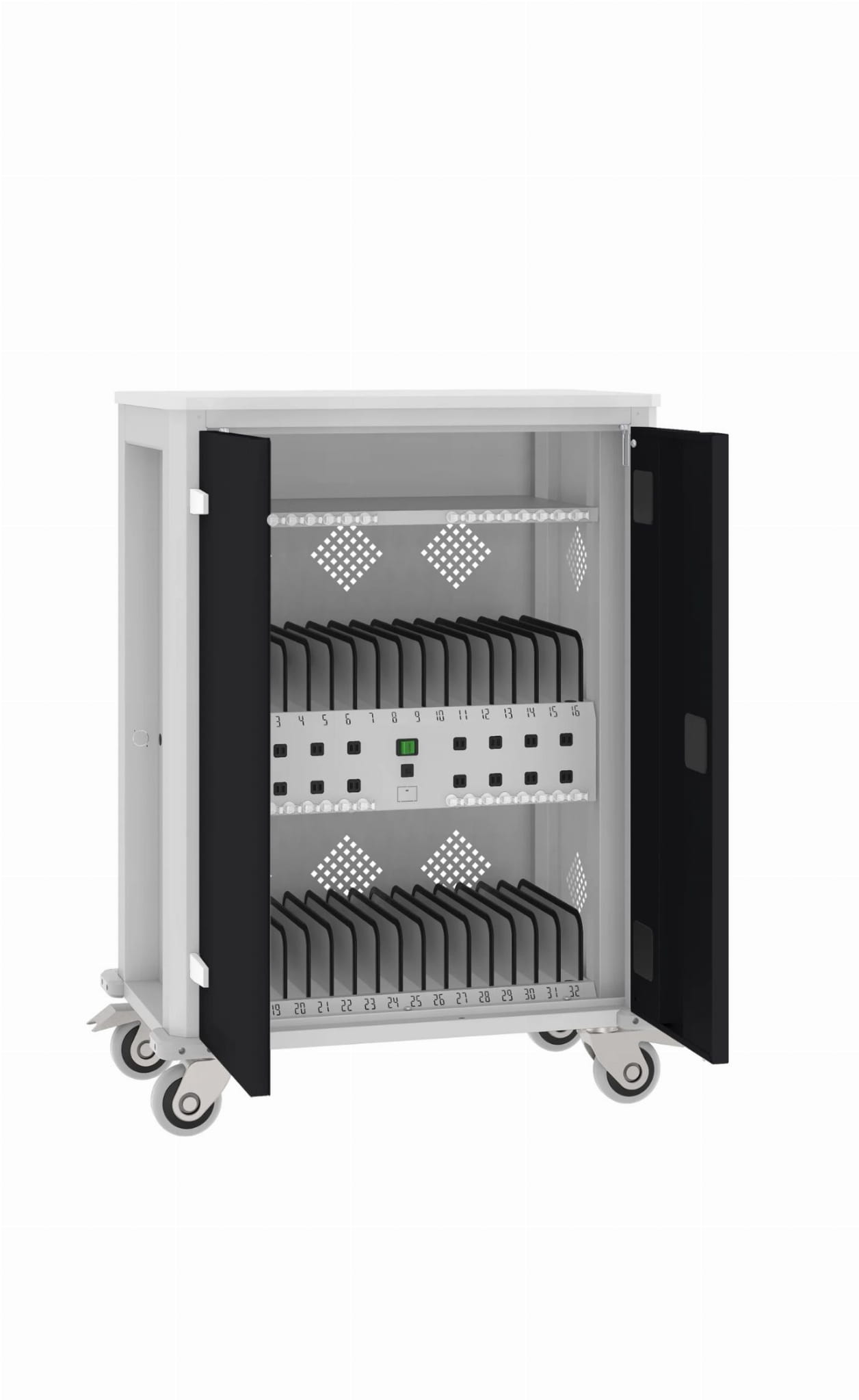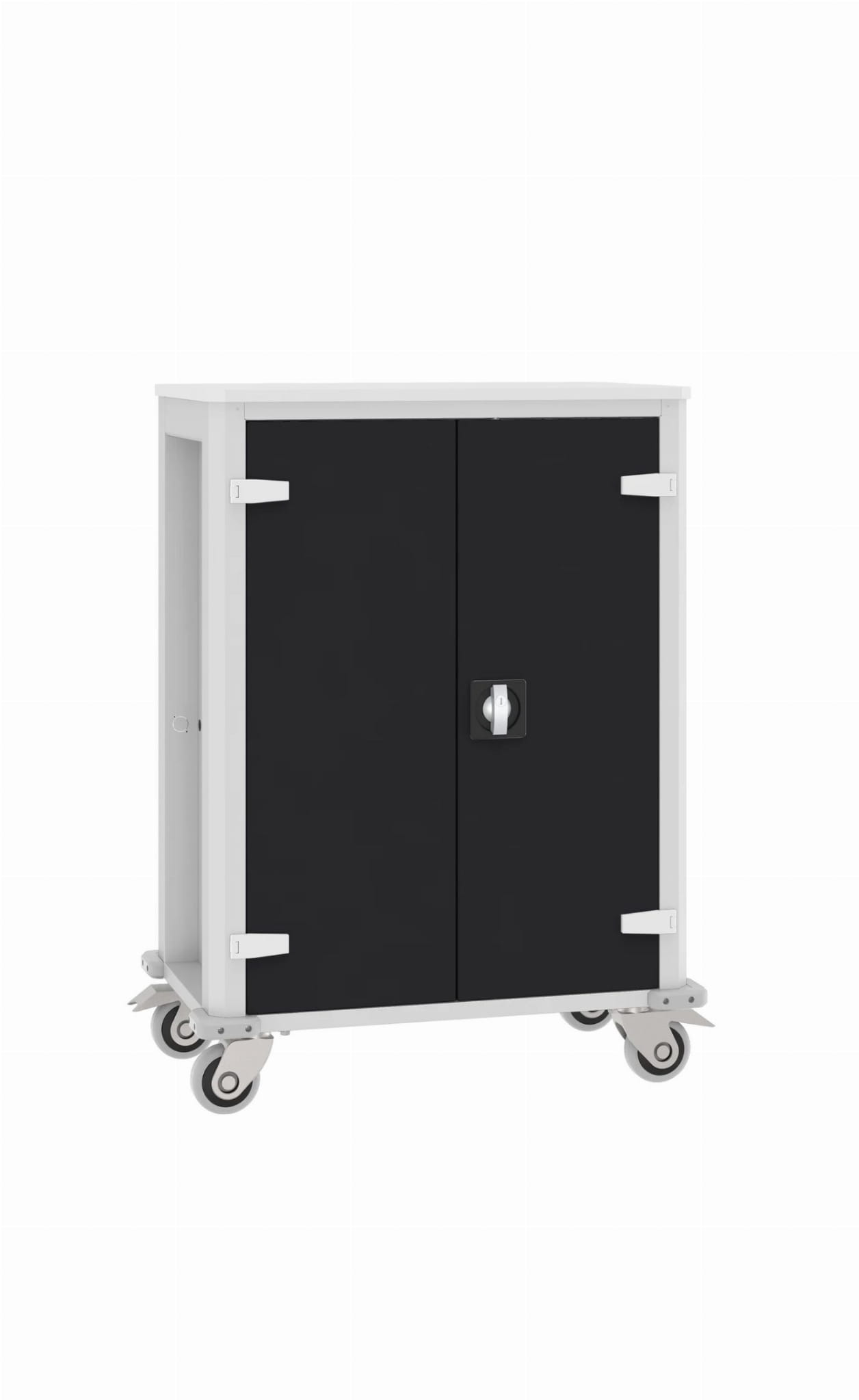 Sprawdza się idealnie w szkołach, na uczelniach, bibliotekach czy salach konferencyjnych, czyli wszędzie tam, gdzie istnieje konieczność bezpiecznego przechowywania i jednoczesnego ładowania tabletów. Zawartość szaf jest chroniona przez drzwi wyposażone w zamek. Przemieszczanie wózka jest możliwe, dzięki 4 skrętnym kołom.
