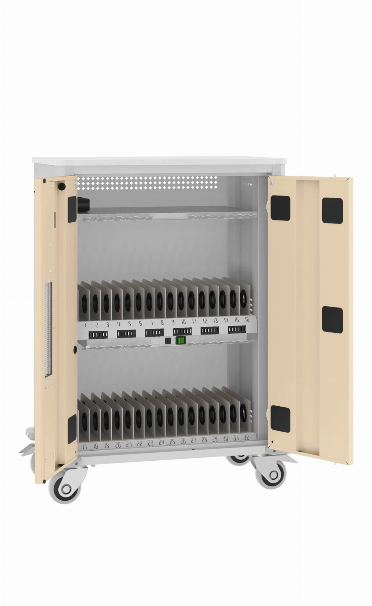 Sprawdza się idealnie w szkołach, na uczelniach, bibliotekach czy salach konferencyjnych, czyli wszędzie tam, gdzie istnieje konieczność bezpiecznego przechowywania i jednoczesnego ładowania tabletów. Zawartość szaf jest chroniona przez drzwi wyposażone w zamek. Przemieszczanie wózka jest możliwe, dzięki 4 skrętnym kołom.
