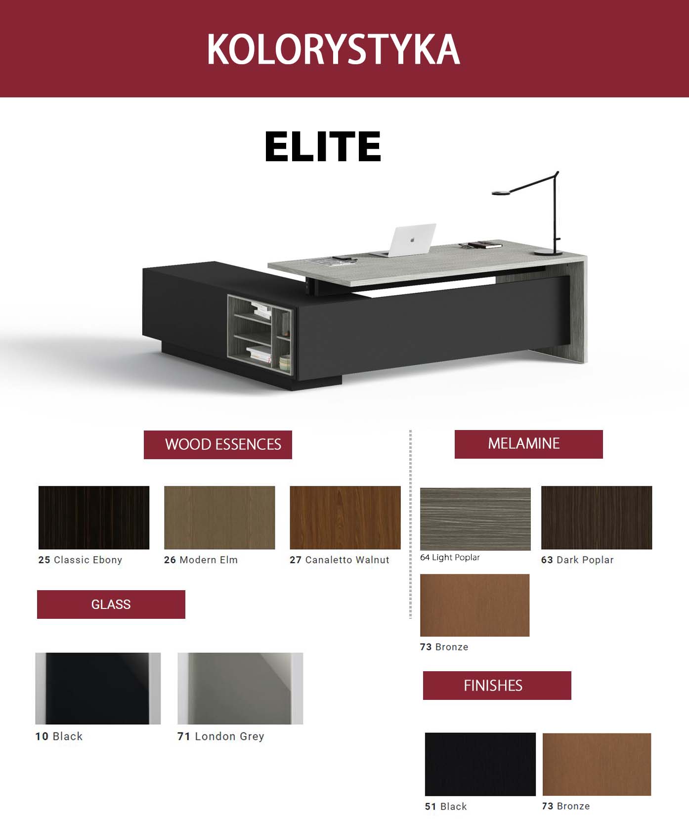 Kolorystyka mebli Elite (standardowa i opcjonalna - o szczegóły i możliwości konfiguracji kolorystycznych pytaj naszych doradców)